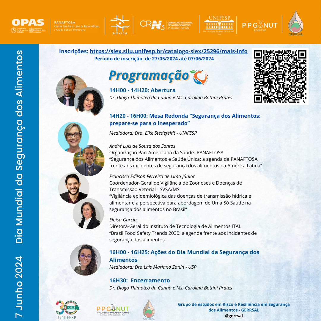Para celebrar a data, entre outras ações, o Grupo de Estudos em Risco e Resiliência em Segurança dos Alimentos (GERRSAL) realizará um webnário nesta sexta-feira (7/6), das 14h às 17h, com transmissão via YouTube. A atividade recebe o apoio do Conselho Regional de Nutricionistas 3ª Região e de instituições como a Organização Pan-Americana da Saúde, a Anvisa e a Universidade Federal de São Paulo. Confira abaixo a programação completa e inscreva-se aqui.