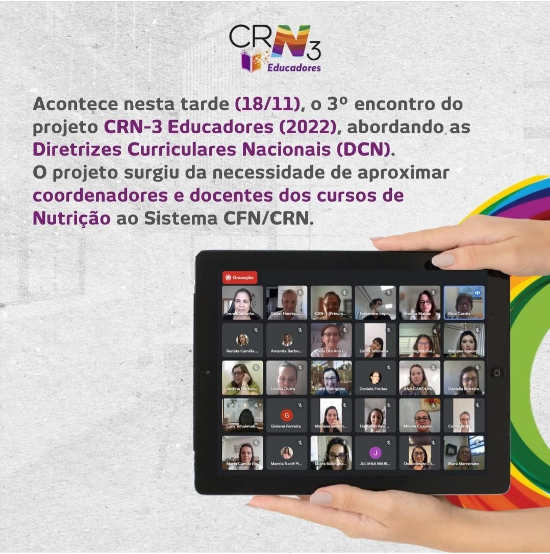 No ano de 2022 a Comissão de Formação Profissional instituiu por meio da Portaria CRN-3 377/2022 o Programa CRN-3 Educadores, com o objetivo de atuar lado a lado às entidades formadoras, pelo acolhimento e aproximação com as IES, com os coordenadores e docentes, reforçando a adoção das normas e diretrizes educacionais e as da Ciência da Nutrição, visando contribuir para uma formação profissional coerente com as exigências técnicas e éticas, resguardadas ao desenvolvimento de competências e habilidades da categoria.Os encontros tem a proposta de estimular a discussão sobre temas relevantes para o desenvolvimento da formação de nutricionistas e técnicos em nutrição e dietética, possibilitando a contribuição de todos os participantes.